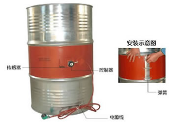 油桶加熱器又稱油桶加熱帶,硅橡膠加熱器 硅膠加熱板的一種。采用硅膠加熱板的柔軟特性、可彎曲特性,在加熱板的兩邊預(yù)留孔位鉚上金屬扣,用彈簧扣在桶體、管道、罐體上。安裝方便、快捷。可使硅橡膠加熱板利用彈簧的拉力緊貼在被加熱部位,加熱迅速,熱效率高。油桶加熱帶通過加熱使桶內(nèi)的液體、凝固物容易取出,如桶內(nèi)的粘接劑、油脂、柏油、油漆、石蠟、油和各種樹脂原料,通過桶體加熱,使其粘度下降均勻,減輕泵的功力.因此,此裝置不受季節(jié)影響可常年使用。油桶加熱帶表面安裝傳感器(PT100溫度傳感器、0~180℃溫度旋紐或恒溫器)調(diào)節(jié)直接控制溫度。